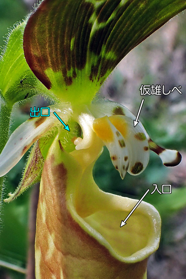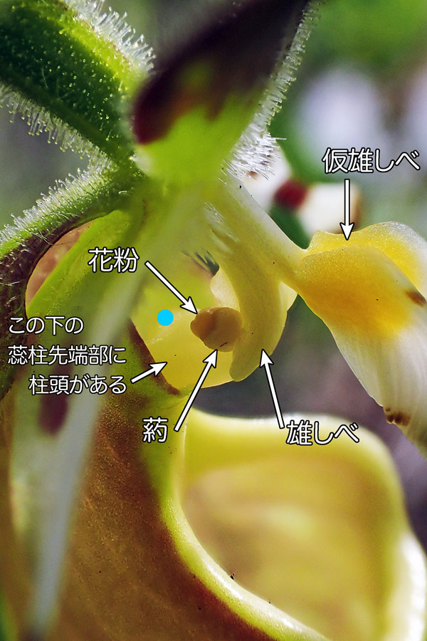 さらに、もしその虫がすでに他のキバナノアツモリソウを訪れていた場合、出口付近の柱頭に虫の背中の花粉が付着し、受粉が行われます。