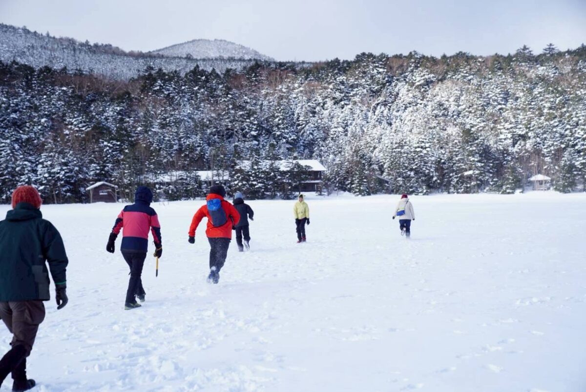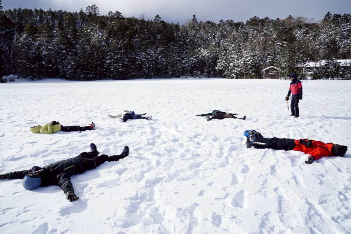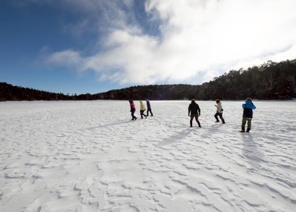 翌朝は白駒池へ。冬季のみ結氷した湖面の上を歩くことができます。ふかふかの雪に寝転んで、宙を飛ぶように流れる雲の動きを眺めました。