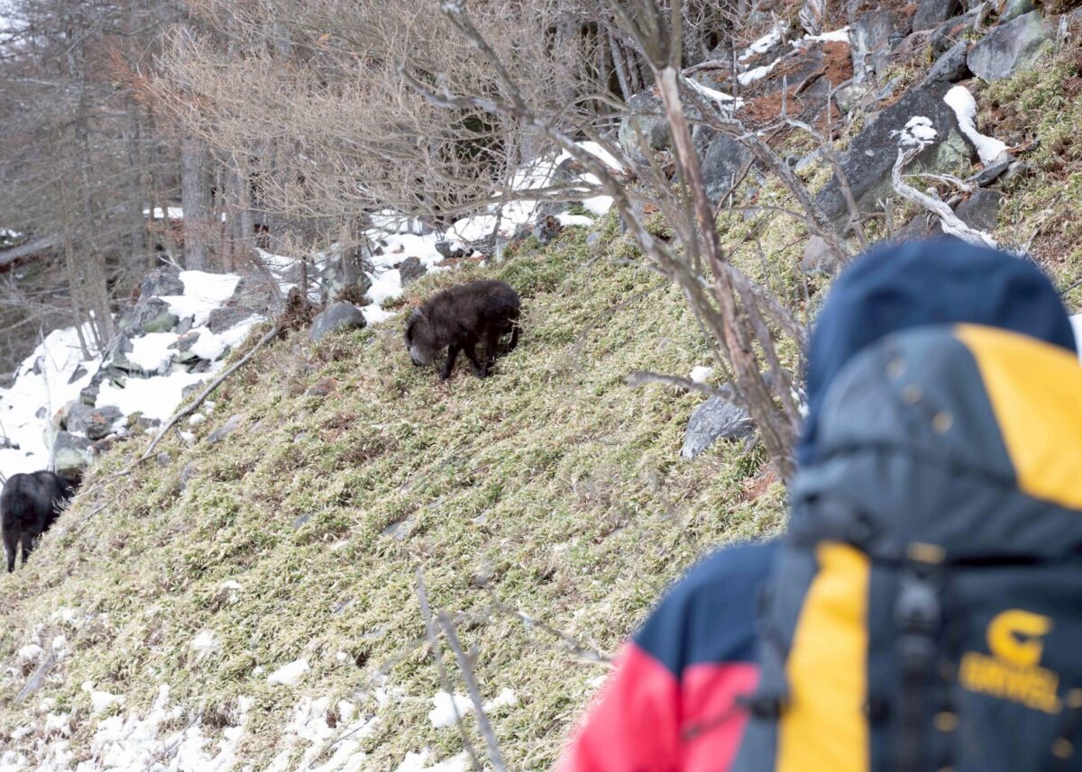 高見石小屋に帰り、下山です。登山口の渋の湯に戻ると、2頭のカモシカが草を食んでいるのに出会えました。