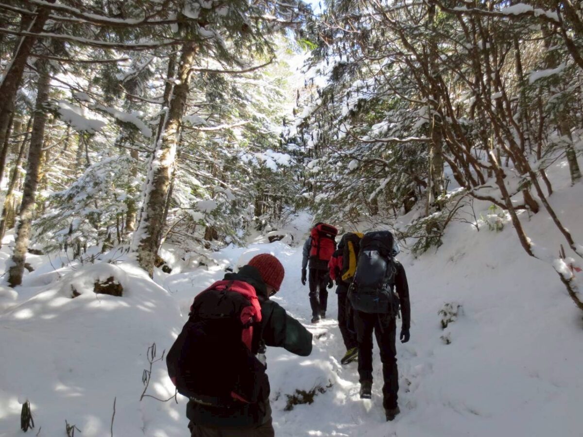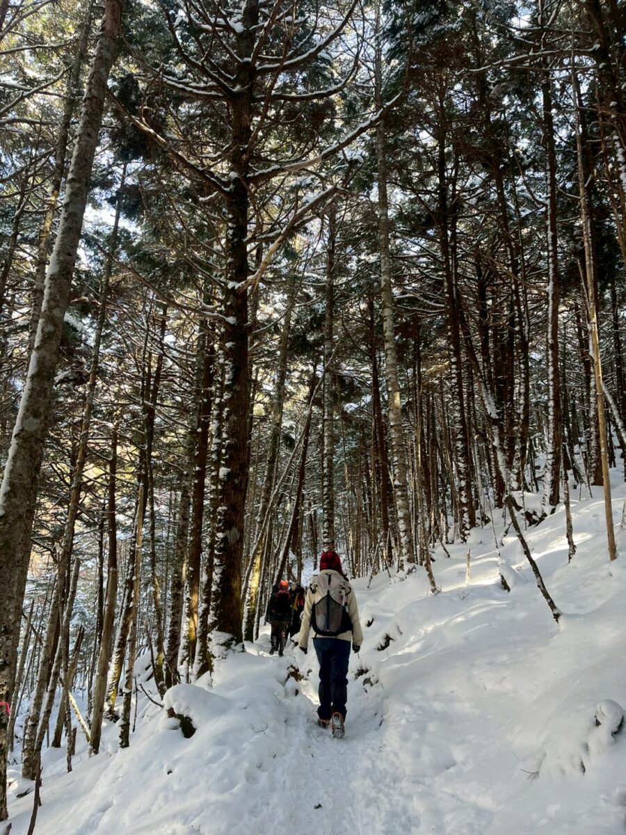 登山口は渋の湯から。しんとした爽やかな森の中、雪を踏むリズミカルな音が心地よかったです。