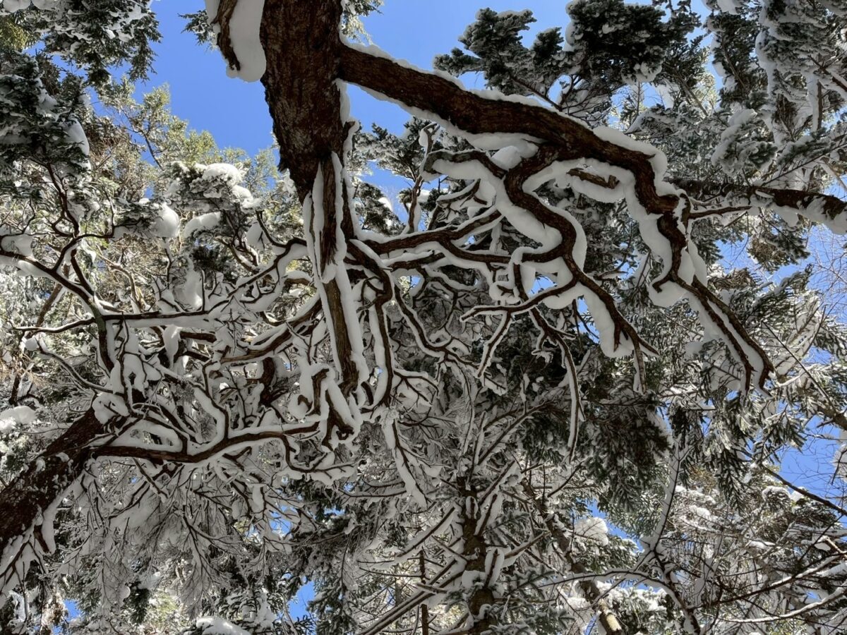 標高が上がると、雪の付き具合が変わりました。こういう不思議な雪の付き方は初めて見たかもしれません。一期一会の景色です。