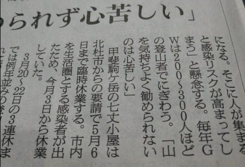 山小屋として自然の中で憩おうとされる皆さまを受け入れられないのは残念なことですが、ひとたび気を抜けば燎原の火の如く感染が広まりそうなこの状況ですから、今回ばかりは仕方がないように思います。