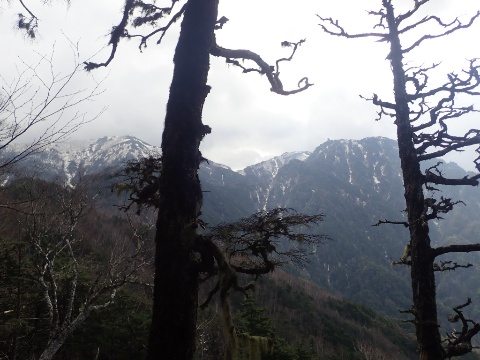 途中から見たオベリスクと観音岳。樹林帯は雪がまだ多いですが、稜線はだいぶ溶けているように見えました。
