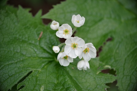 小屋の前ではサンカヨウやヒメイチゲが間もなく開花。サンカヨウは雨に濡れると透明になります。