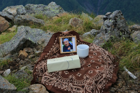 高嶺山頂に到着されると、大きな北岳を眺めながらよしきさんにお土産をお供えして献杯されました。