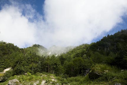 曇りとピーカンのコラボレーションが素晴らしい今朝の小屋からの景色♪ 地蔵岳からのびる岩尾根と落葉松林は水墨画のような世界で、天気を選ばず美しいもんです。