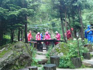 2009/08/07 15:27 パッと咲く 小屋の外で声がすると思い、外に出てみると、まるで、花が咲いたみたいに鮮やかなカッパを着たレディーが。なんか凄い強烈な印象を受けました。みなさん伊豆から来たようです。伊豆!羨ましいですねー 魚介類美味しいし♪
