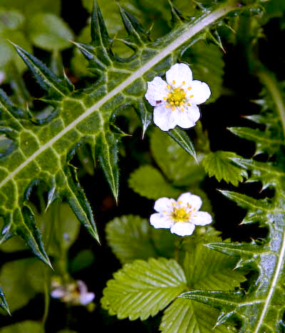 2009/07/22 08:33 トゲに花 シロバナヘビイチゴにアザミ。 8月過ぎると、イチゴミルクかよ!ってな味の実をつけるんだ。コイツの果実酒は素晴らしい! 女のコは絶対好きだろうなー 小屋の前に一輪だけ、タカネビランジが咲いてました。