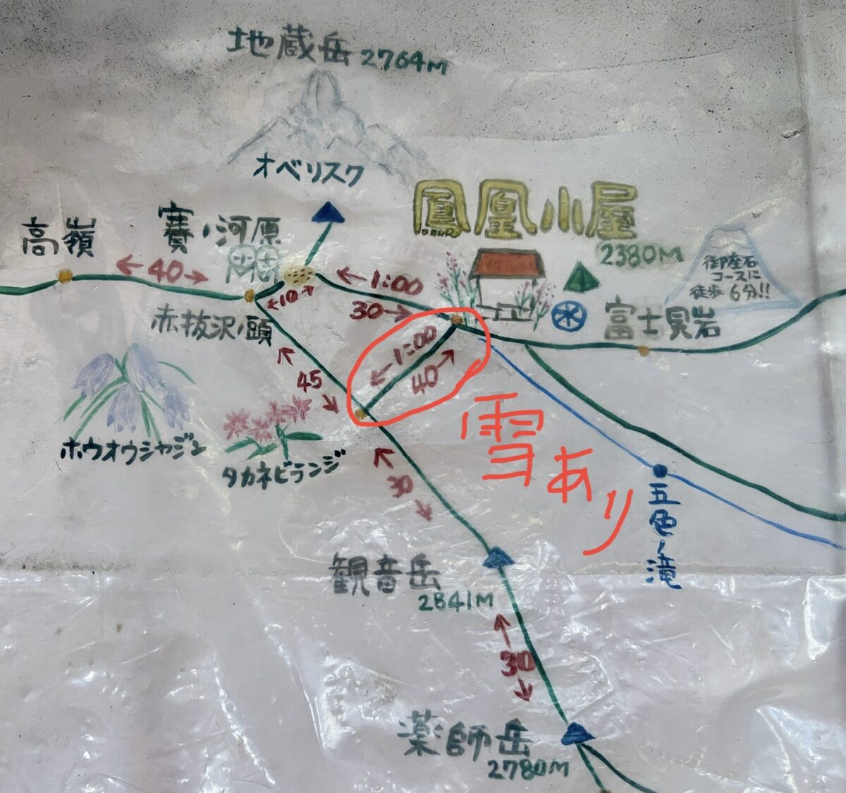 登山道の雪はほぼ溶けました。「鳳凰小屋〜観音岳分岐の近道」のみ残雪があります。
