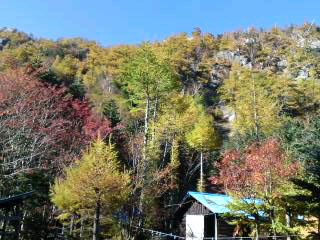いつの間にか素晴らしい発色を魅せる、小屋の裏山全体を覆うカラマツ。白い岩壁に浮き出す黄色は圧巻ですよ。 今日は片山氏が下山、美しい女性とともに、ニコニコと帰って行きました。 明日からは小屋周辺のカラマツ特集をお届けしますね。