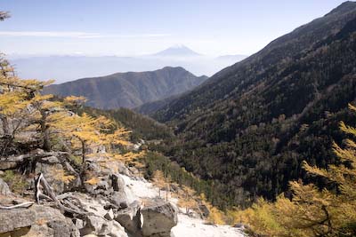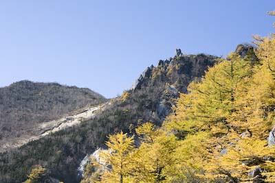 フィナーレへ地蔵岳。アクセントある景色は惹かれるものがあります。今は黄色の独り勝ちという感じですね。 そういえば、オリオン座流星群とかなんとか、流れ星が多く出現するみたいです、今日は。小屋の空にはいつも満天の星空がありますが、あまり興味がわいてこないです。なので、寝てる確率がほとんどだな~