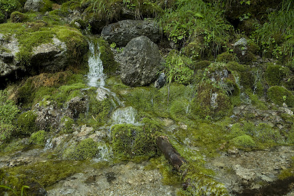 !? 柔らかく大地を包む苔、そんな中からゴンゴンと吹き出てくる水…不思議に思い、上部を何度も確認してみる、そこは森が奥へとのびるだけ…人を寄せ付けぬ風が流るその場所、入口と言わんばかりに湧き出る水、不思議な場所に出会えたな。