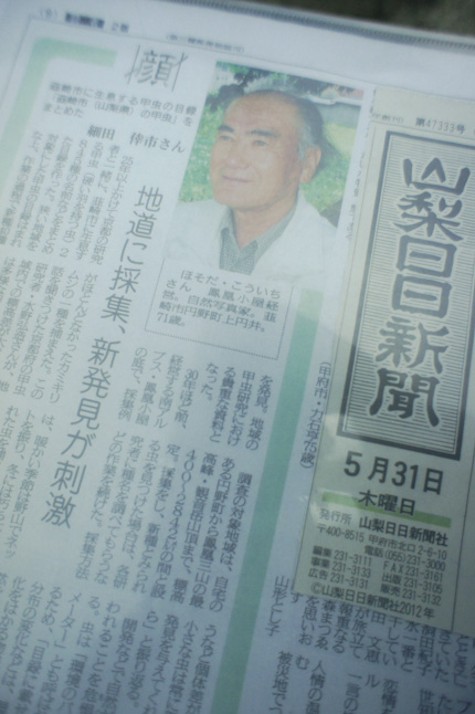 事後報告になりますが、鳳凰小屋のオヤジが山梨新聞の「顔」の欄に登場しました。山梨県の虫研究の成果が取り上げられてます。