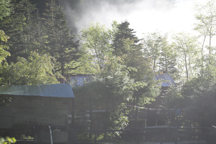 先週よりはかなり少なくなってきてますが、まだまだあります。新雪が少し降ったようで、小屋の周辺の森は白っぽいですよ。明日の日中で消えてしまうのが残念ですがね。 現在の気温は4℃。テント場に一張り、ポツンとお客様がいるだけ、静かな夕方です。テント場の地面はまだ雪ですが、来週には消えてきそうですよ。
