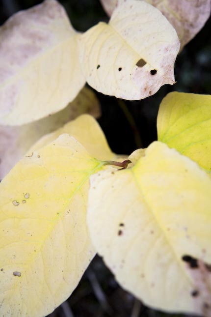 小屋周辺の植物に小さな紅葉がみられます。これはイタドリだと思いますが、彩を失う様は、雑草のような植物でも本当に美しいです。 メインは樹木ですが、ヤナギランやグンナイフウロなどの葉っぱも小さな世界で様々に発色するので、庭をじっくり観察しても楽しいですよ。