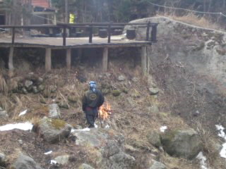どうしたの? 急に思いたったのか、雪もまばらなヤナギラン畑に火をつけて歩きだしたオヤジであります。朝から炬燵に全力で火を入れたはずなのに… ウ~寒くなってきました。地蔵岳から吹き下ろす風が痛いぐらいに冷たいです。あと30分もすると雪が舞うかな。