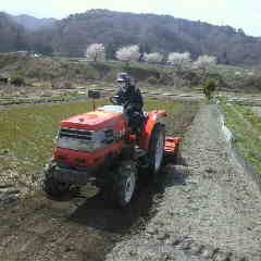 春の陽射しのなかあちらこちらの田圃に耕耘機が見られます。暖かくなり田圃が乾いたので耕耘機で耕しています。このあたりでは稲刈りのあとに一回目、今が二回目、苗代の前に三回目を耕します。米作りは農機具にお金がかかり大変だそうです。 細田倖市