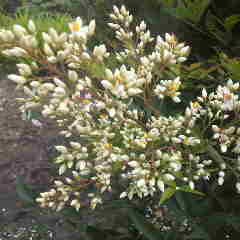 ナンテンの花です、難を転ずるとして庭木として植えられます、葉や実は縁起物として使われます。冬に赤い実を見ることはあるでしょうが花は今咲きます。 梅雨の今庭木に花が咲くのが少ないから南天の花に出逢うと心和みますね。 細田倖市