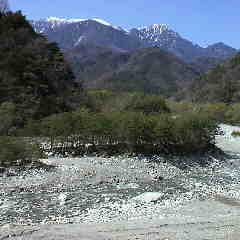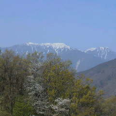 春の山麓は新緑の真っ只中、山桜や新緑が綺麗です。鳳凰三山はまだまだ真っ白です。 細田倖市