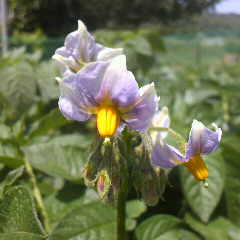 茄子やトマトもジャガイモの仲間です。花は良く似ています。ジャガイモの花は良く見ると綺麗な花です。自宅で作られたジャガイモは夏に荷揚げしてカレーの材料にします。今年も沢山収穫出来るといいなぁ。楽しみです。 細田倖市