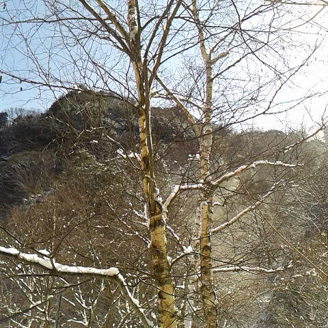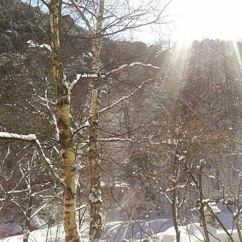 日差しが暖かいです。御座石温泉付近では雪景色です。林道には雪が有りました。冬タイヤであれば御座石迄に入れます。 細田倖市