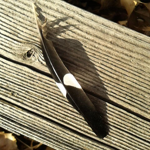 散歩中に啄木鳥の風切り羽根が落ちていた。スマートで模様も綺麗です。本の栞にします。お洒落でしょう。 細田倖市