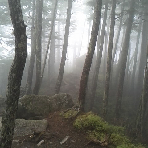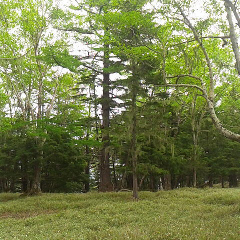 晴れていたけど霧が濃くなりました。霧の中のコメツガと苔の林。幻想的ですね、もののけ姫の世界に迷いこんだ感じです。 細田倖市