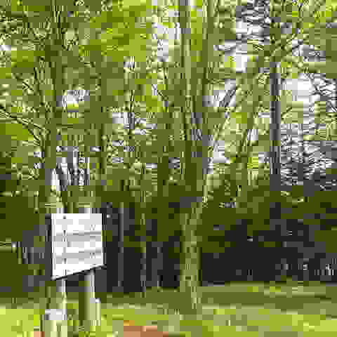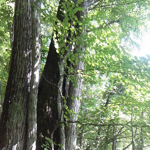 桂の大木、緑の林の中、エゾハルゼミが盛んに鳴いています。木漏れ日の林は涼しく登り易いです。 細田倖市
