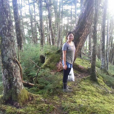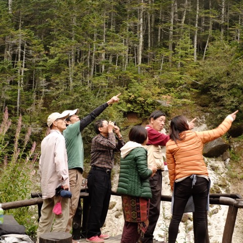 美女と苔の森と言いたい所ですが残念ながらうちのスタッフと松茸採りのひとこま。こんな綺麗な所にも沢山生えていました。鳳凰小屋から燕頭山迄の登山道脇に二ヶ所で危なくない場合に7本生えているのをお客様が松茸採りできる様に残して有ります。探して見ませんか。小屋関係者は採ることは厳禁。 細田倖市