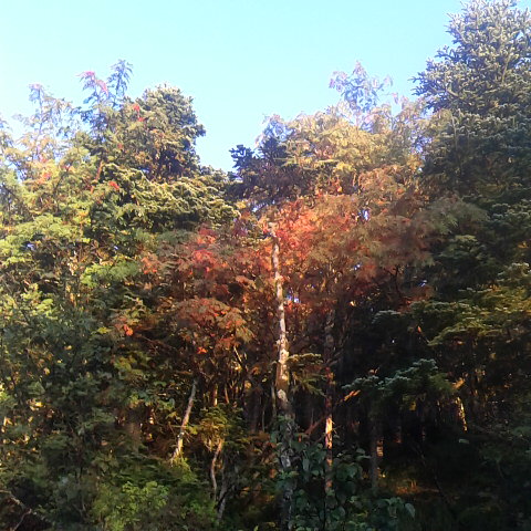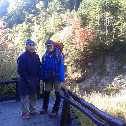 今朝の気温は4度、快晴の良い天気です。昨夜は雨が降り皆様心配していたけど朝は晴れていたので喜んで出発しました。初霜が降り冷えましたが日増しに木々が色付いて来ました。小屋の周りナナカマドも綺麗に色付いています。今年の紅葉は色付きが良いです。 細田倖市