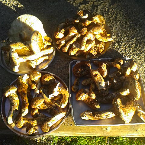 今日は秋晴れの良い天気です、昨日登りながらの松茸を大収穫。今日は元小屋従業員が松茸採りに来ています。持ちきれない程の収穫でしょう。 細田倖市