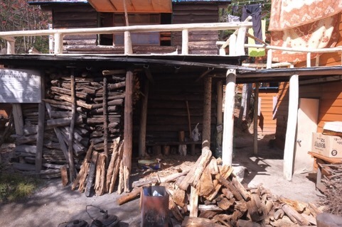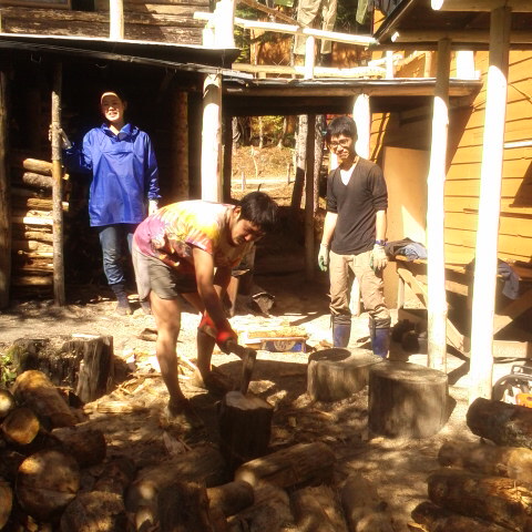 今日の作業は薪作りです。スタッフ4人で総掛かり。朝早くからの作業で昼前に終わらせて、午後からはお客様を待っています。 細田倖市
