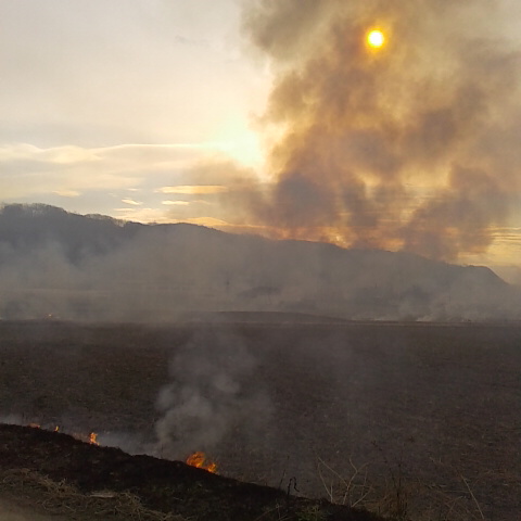 朝8時から町内一斉の芝焼きです、始めは晴れていましたがだんだんと曇ってきました。田圃の畔や土手、道路の斜面などを燃やします。消防団も出動して人家に近い場所や延焼しそうなところでは待機して燃やします。害虫駆除や景観保全の為に町内一斉に行う行事です。 細田倖市