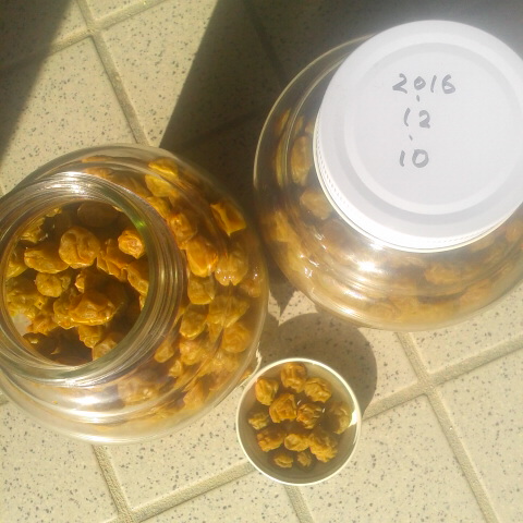 一昨年の12月に干した梅干し。いつまでも味も香りも変わらずに美味しいです。ビンに詰めて常温の暗い場所に保存して置きます。梅を収穫して素早く洗い水気を拭き取り、市販のラッキョウ酢に漬け込んで半年保存して寒中の風があり天気のよい日に二三日干しシワシワが出来たらガラスビンに詰めて常温で保存。簡単でとても美...