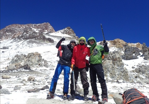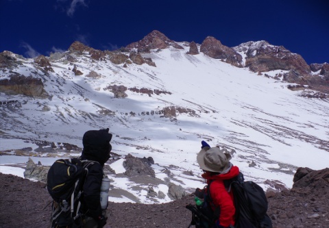 C3コレラにて。左からとっきーくん・ゼビくん・ぼく。左上がアコンカグア山頂。2/10ニド3日目。寝起きにまだ軽い頭痛。でも、動き出すと頭痛が消えた。今までに比べると、ずいぶん調子がいい。9時半からC3コレラ(5,970m)へ高度順応に出発。今日は数日後のアタックを占う試金石だ。装備も当日とほぼ同じ、...