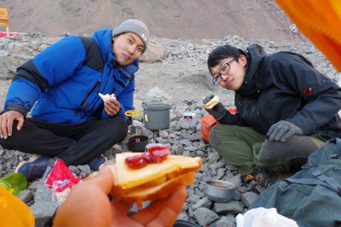 BCで食べた即席チーズバーガー。左がケンくん、右がとっきー。《2月11日 BCにて休養》10日目。久々にBCで朝を迎えた。ずいぶん眠ったのに、まぶたが重たい。高所で知らぬ間に疲れがたまっていたようだ。今日は最初で最後の完全休養日にして、1日のんびりすることにした。とっきーくんが確認して来てくれたイン...
