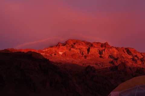 (写真)前々日の2月11日。BCムーラスから見た夕焼けのアコンカグア。これ以上ないほど紅く染まる山肌。それをなぞるように不思議な雲がたなびいた。《2月13日 C2ニド→C3ベルリン》アコンカグアの山頂を踏むため、あらゆる想定をしてきたつもりだ。出発時間、通過時間の目安、装備、体調がこうなったら、天気...